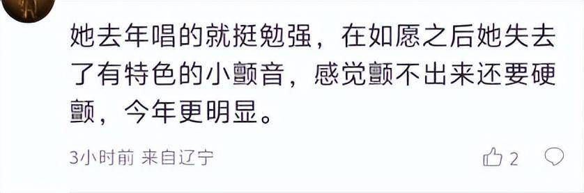 有点气泡感的音色本是她自己的特色,这次听着却是单纯唱不上去,有网友挽尊说,不是她唱的难听,是她真唱没修音。