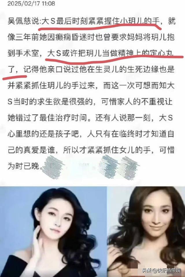尤其是吴佩慈曾经还说过,大s临终前拉着玥儿的手,求生欲很强,心里非常放心不下两个孩子。但是终究还是拗不过命运,撒手人寰。