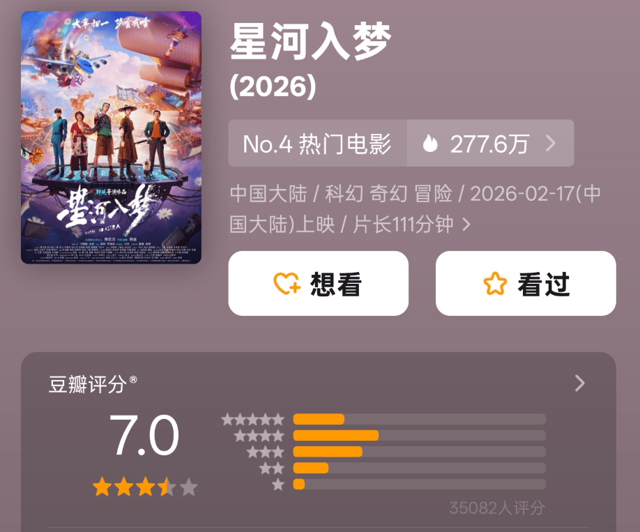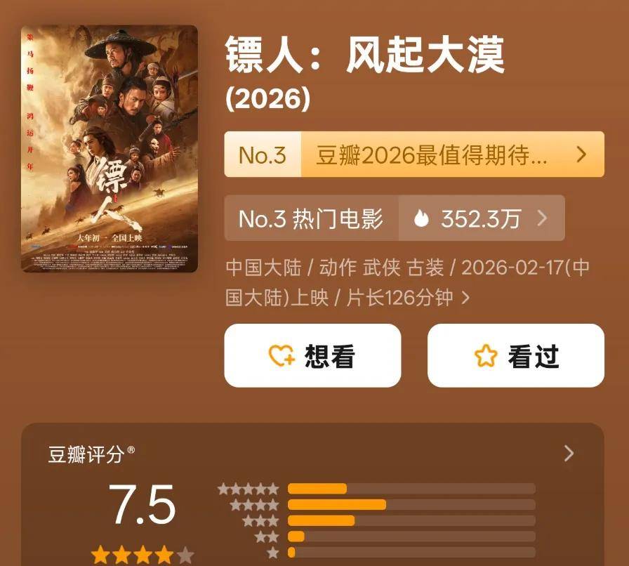 2026年春节档电影陆续出分了,有些出乎意料,又似乎情理之中。目前春节档已有四部真人片开启了评分:《飞驰人生3》拿下7.6分,暂列第一;《镖人:风起大漠》评分破7.5,口碑逆袭;《星河入