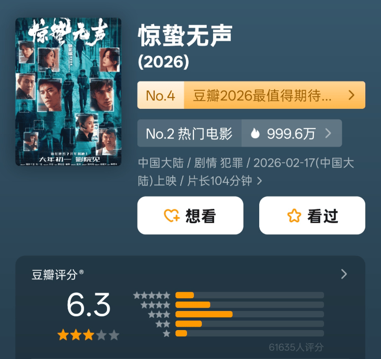 目前春节档已有四部真人片开启了评分:《飞驰人生3》拿下7.6分,暂列第一;《镖人:风起大漠》评分破7.5,口碑逆袭;《星河入梦》评分7.0,表现不错;《惊蛰无声》只有6.3分,默默垫了底。