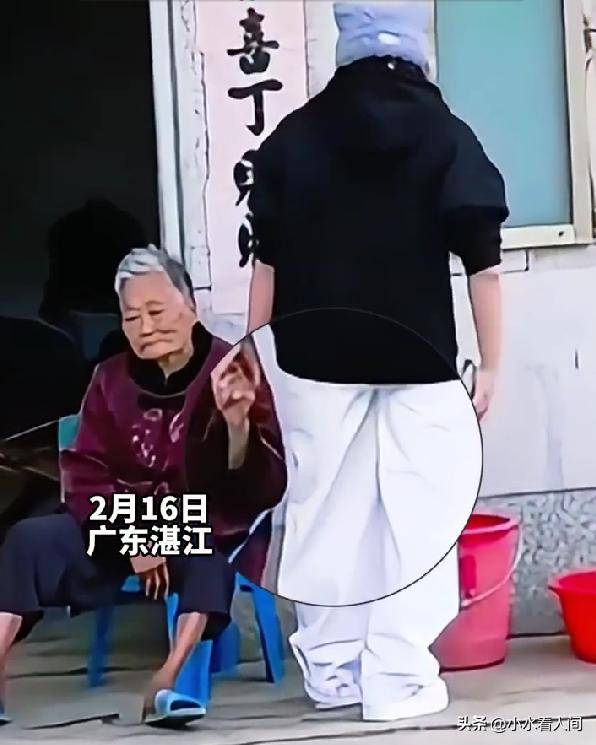 奶奶已经老了,裤子穿得挺单薄的,还没穿鞋,可能广东冬天不太冷,老人家也习惯光脚穿拖鞋,没那么讲究。