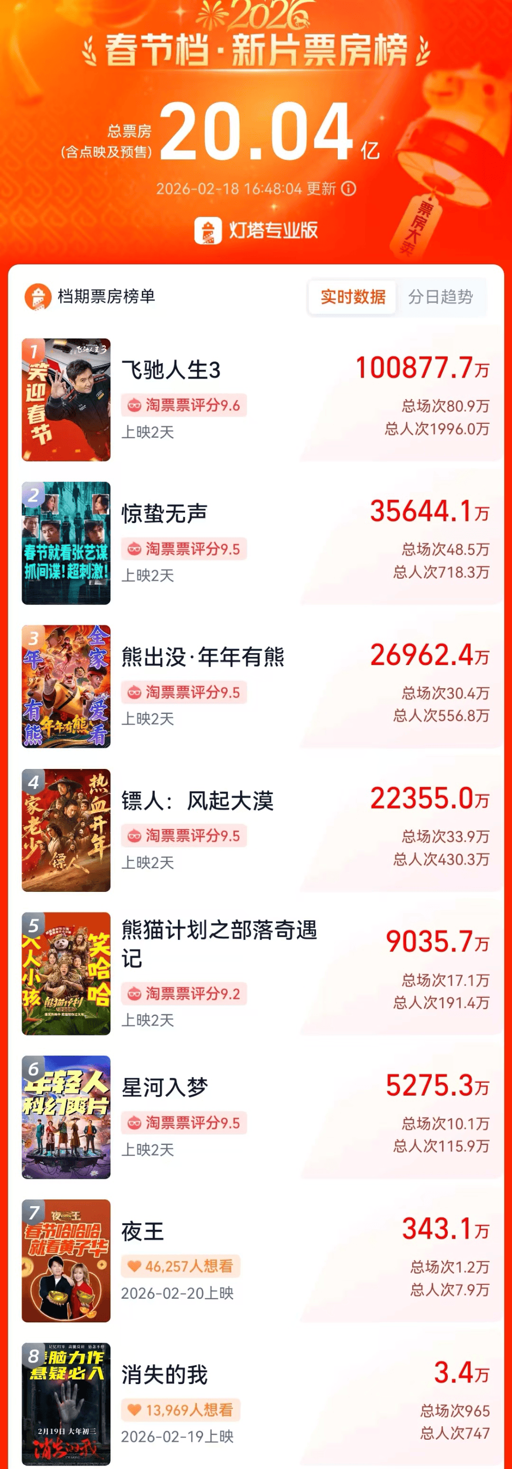 截止2月18日16:40,春节档电影总票房突破了20亿元。