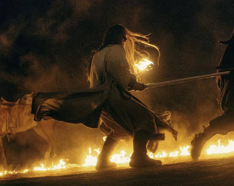 打斗时扬起的尘土是真的,马蹄踩出的痕迹是真的,风沙拂过演员脸上的粗粝感也是真的。这种沉浸式的环境,给每一场打戏都叠加了一层无法靠特效复制的质感。