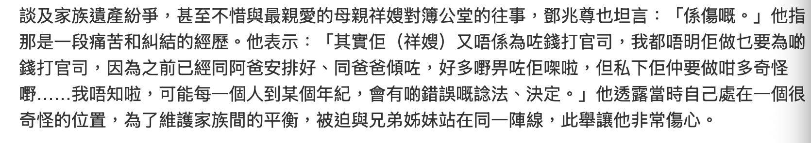 邓兆尊的出身背景,再加上他的人设,注定是受到关注,要成为话题中心的。他上了好友梁思浩的网台节目,谈及了围绕他的多个话题,其中就罕有提及了与母亲洪金梅当年争产这件事。虽然事情已经过去了很多年,母亲也已经离世了,但是想起当时所发生过的一切,他称还是伤心,而且这是一段痛苦与纠结的经历。当年与母亲争产,他站在一个很奇怪的位置上,为了维护家族之间的平衡,选择站在挚爱的母亲对立面上,与兄弟姐妹同一阵线,结果“两败俱伤”,这件事直到今天都让他难过。