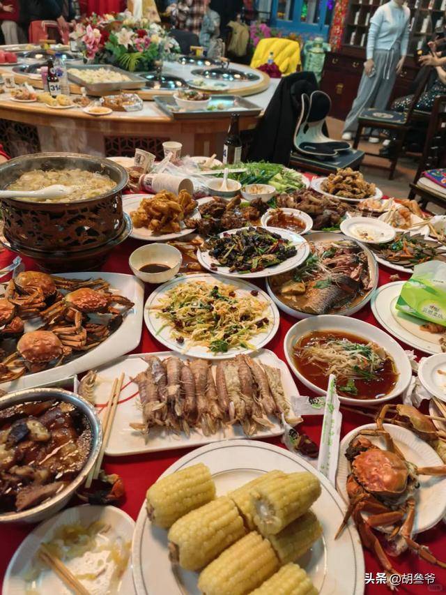 酒店里挂着赵本山的照片,气派得很,桌上的年夜饭更是丰盛,大闸蟹、皮皮虾、大鱼海鲜样样有,啤酒白酒摆了一桌。