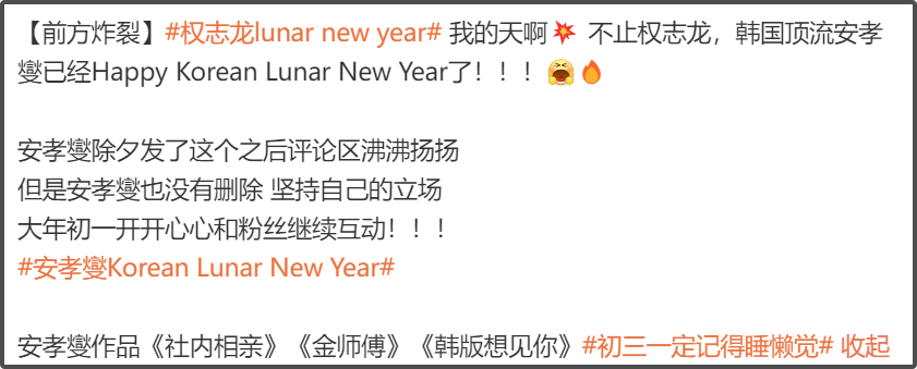 尽管如此,仍然有韩星在暗戳戳搞事,这边权志龙敢在国际音乐节强调“lunar new year”,另一边韩国顶流男星安孝燮就开始“happy Korean lunar new year”,一下子偷了春节和中国农历,两个传统文化,引起评论区争议。