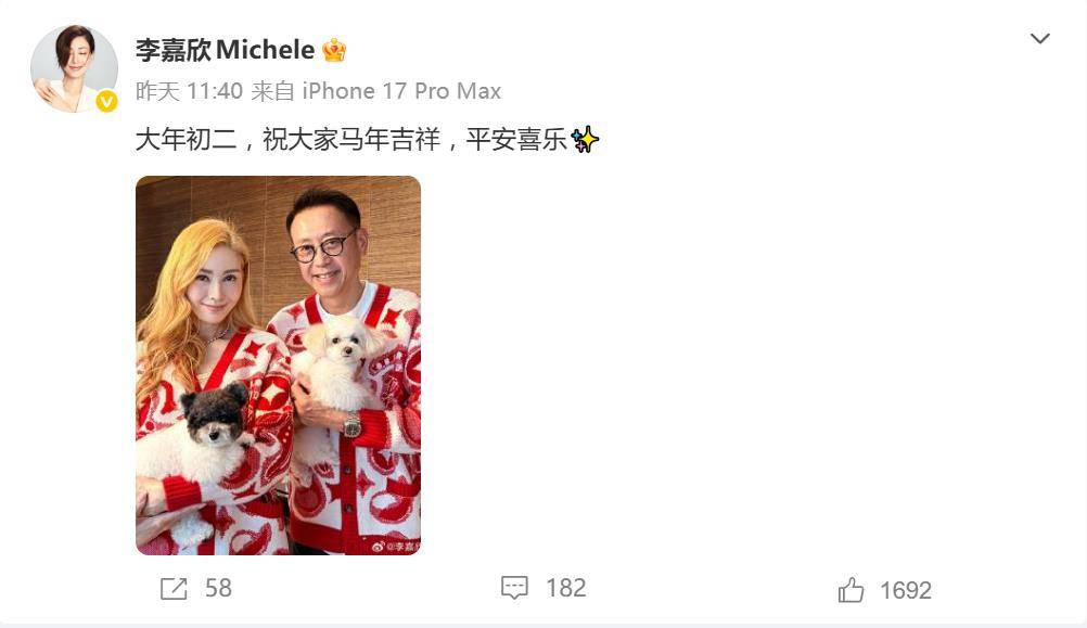 2026年农历新年,一则李嘉欣与丈夫许晋亨在自家香港豪宅庆祝春节的合照,悄然刷屏网络。照片中,55岁的李嘉欣顶着一头崭新的浅金色发型,与丈夫身着红色情侣开衫,各自怀抱爱犬,笑容