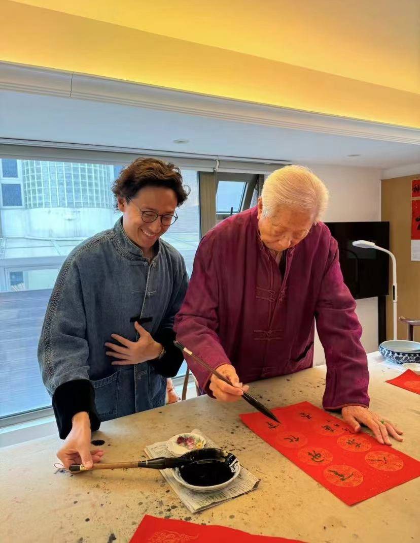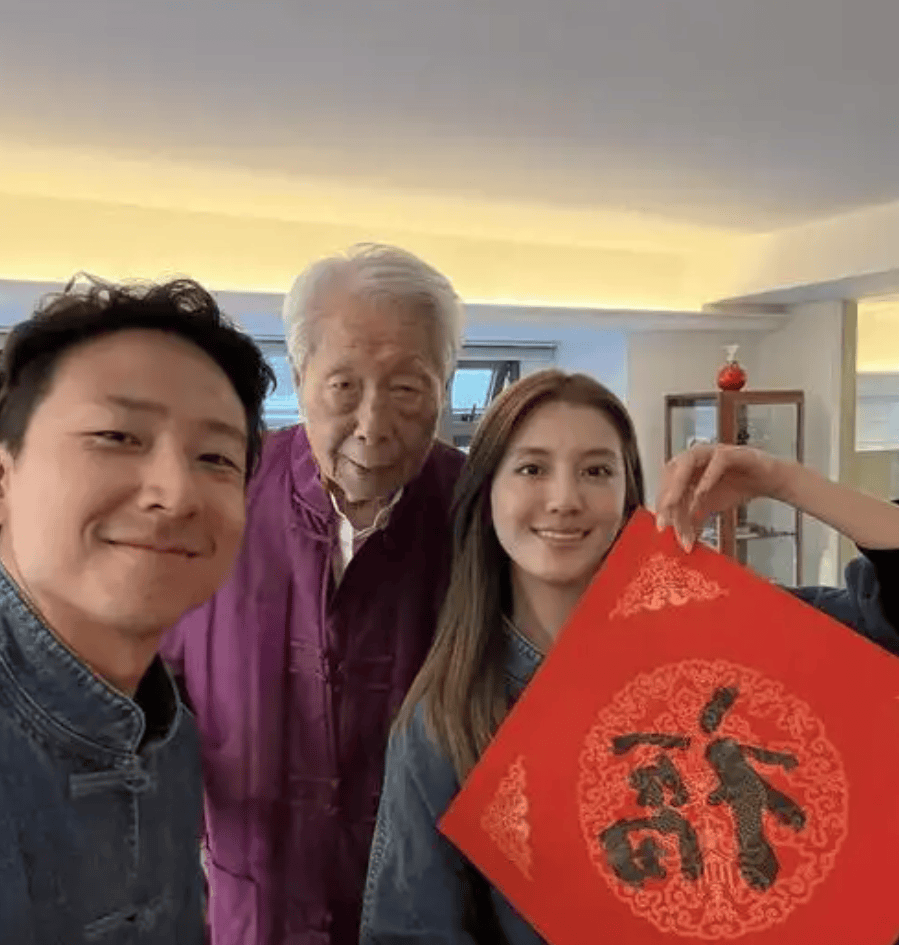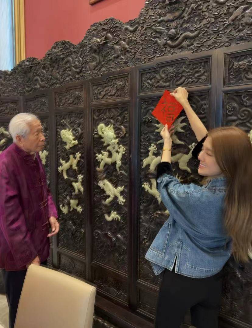 更令人动容的是,90岁的爷爷施子清也出镜亮相。吴千语在书房写毛笔字时,老爷子坐在一旁静静观看,眼神满是慈爱;贴“福”字时,他还乐呵呵凑上前合影,祖孙同乐的画面极具感染力。
