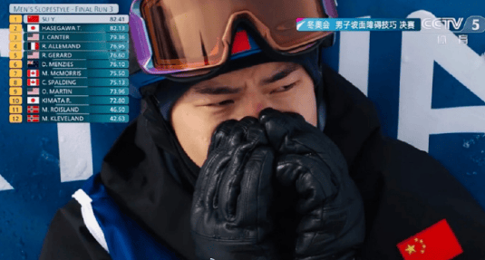 完赛后,苏翊鸣激动落泪,身披国旗欢呼庆祝。他坦言比赛过程“太不容易”,释放了长期备战的压力。