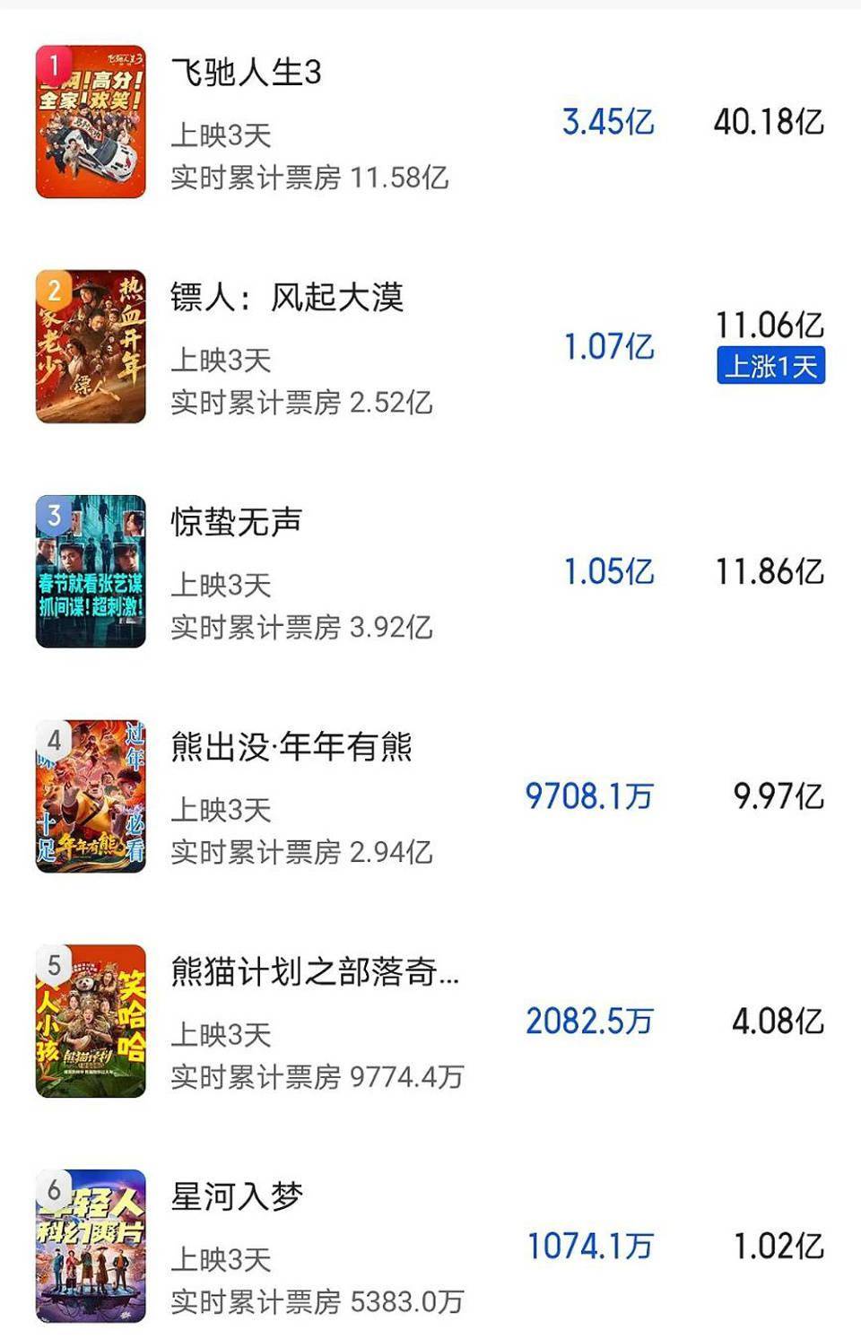 除夕过去两三天了,马年春节档电影《飞驰人生》依旧领跑,《惊蛰无声》紧随其后,但明显已现颓势后劲不足,《熊出没》依旧稳稳的幸福,而《镖人:风起大漠》口碑上涨,有望成为黑马后来居上杀出重围,之后《熊猫计划》只能说意料之中,最后的《星河入梦》则是有点意料之中,又有点意料之外!