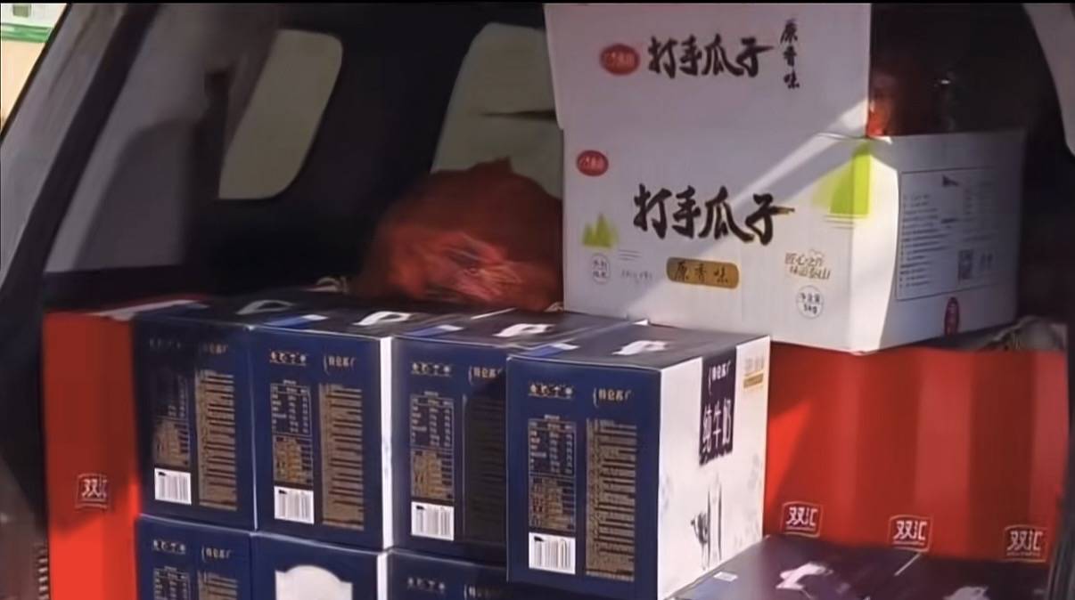 大衣嫂请了人帮忙搬节礼,打开后备箱才发现朱雪梅回娘家带的礼品真不少。大概有10箱牛奶、10箱火腿肠,还有一箱瓜子、一大袋子糖果等等。
