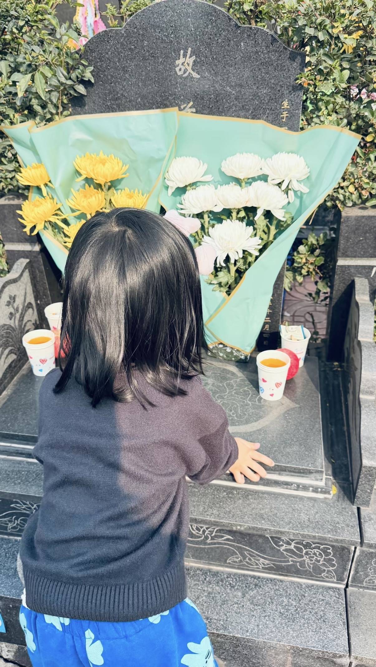 程爸弯腰鞠躬的时候,4岁夏夏也站在一起低头陪着。小女孩才4岁,在坟墓前乖乖的已经很难得了。看夏夏的侧脸,和海哈金喜简直太像了。