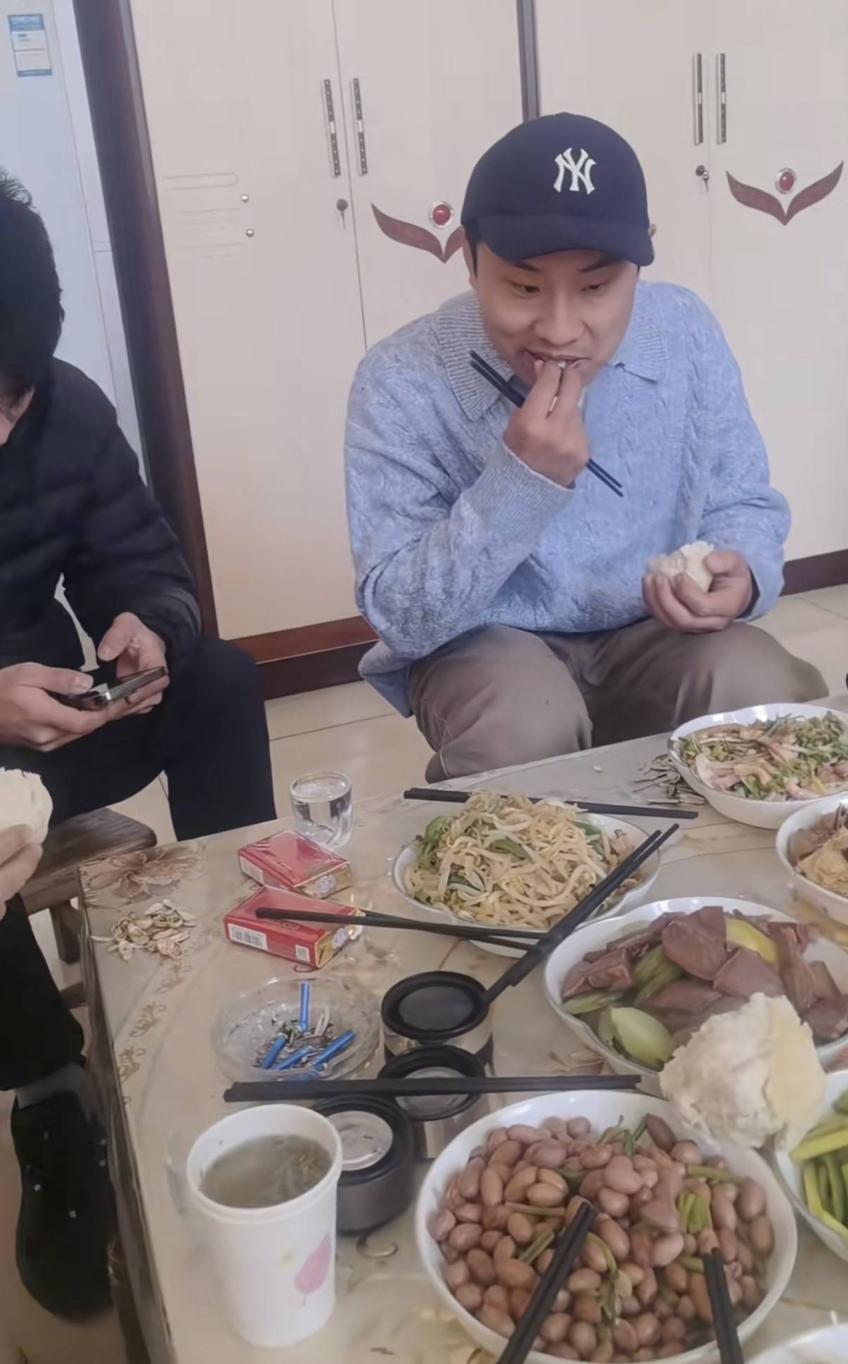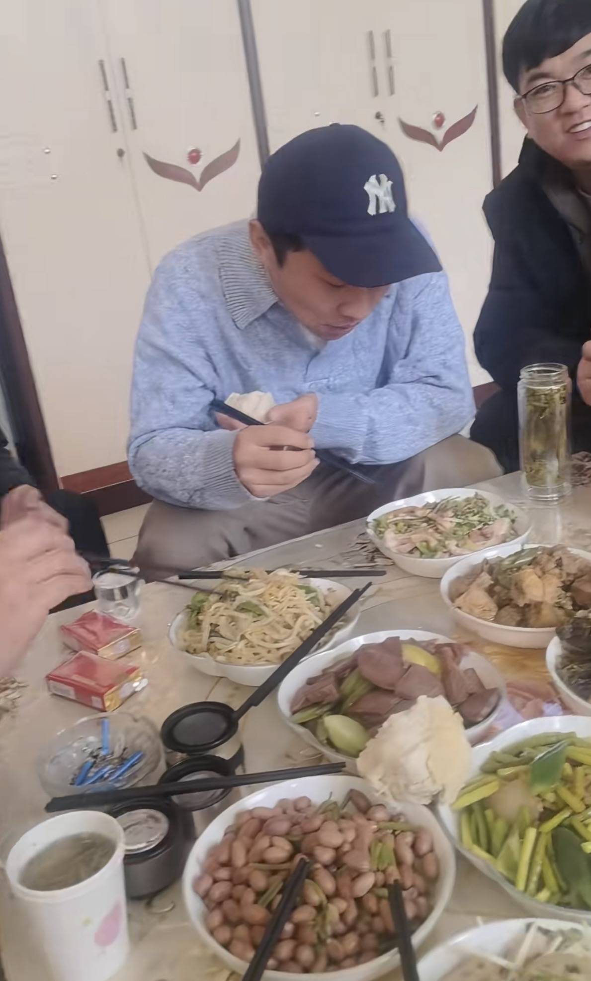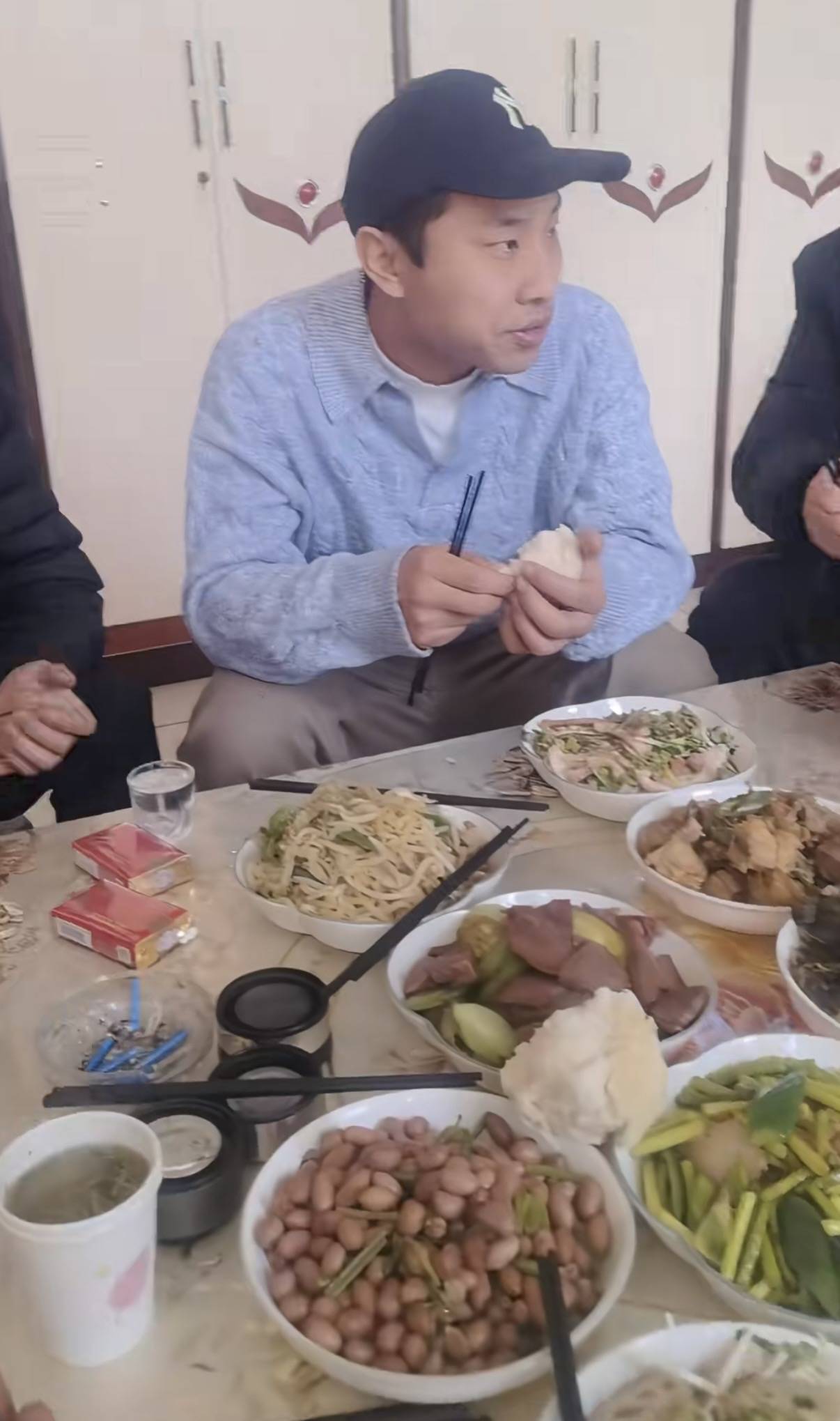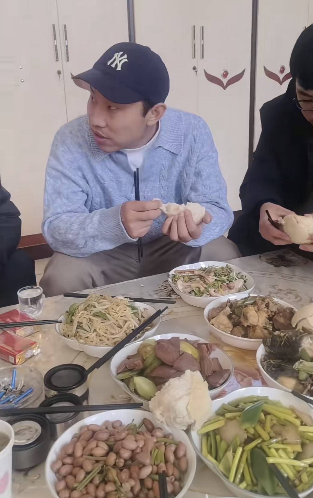 徐志胜穿了一件浅蓝色针织衫、内搭是白色T恤,他戴着棒球帽。和大家一样,坐在茶几前的小凳子上吃饭。