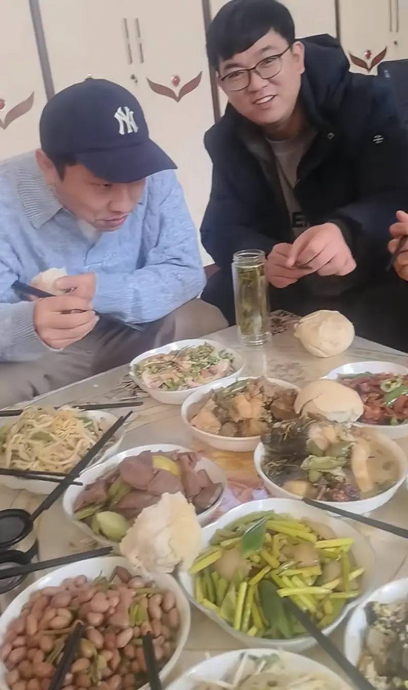 徐志胜的右边是表哥,左边也是一位年龄相仿的男士。大家应该都是为了陪徐志胜,他好不容易回来一次,希望他能吃得尽兴、玩得开心。