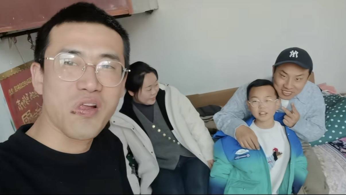 在酒足饭饱之后,徐志胜还和表哥一家合影了。表哥戴着眼镜,看起来是个大高个、长得也挺斯文的。他和小朋友玩的很好,搂着小朋友的肩膀对着镜头比耶。