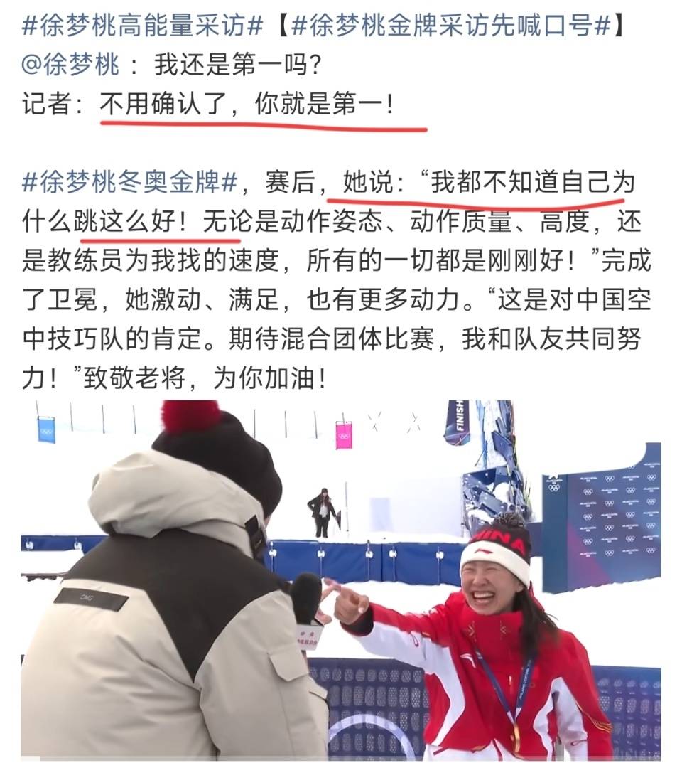 “雌鹰”般的女人徐梦桃,这回轮到浪姐蹭她热度了——引言。徐梦桃拿下冠军后,还在反复问着媒体,我真的是第一吗?冠军真是我的吗?记者兴奋地回答她:不用确认,