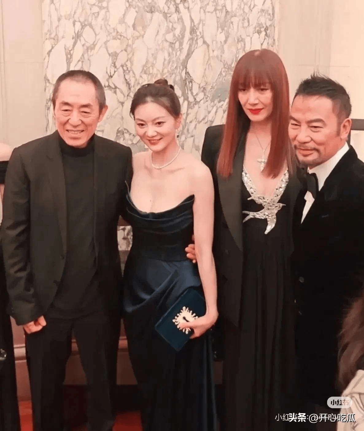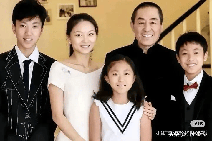 最左边是张艺谋与前妻肖华所生的大女儿张末及其外国女婿,右边是陈婷所生的两儿一女。1999年,18岁的陈婷参加张艺谋电影海选,虽未成谋女郎,却成了其妻子。当时张艺谋已离婚且与巩俐分手,二人隐婚,2001 - 2006年陈婷生下三个孩子。