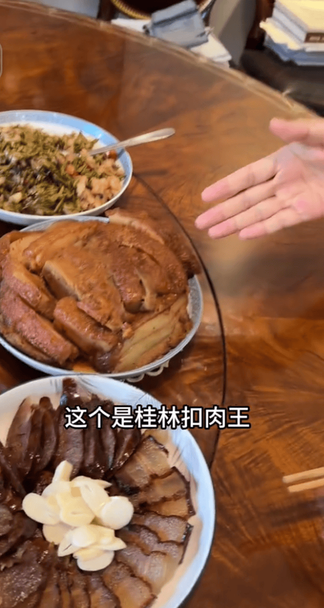 望着一桌家乡美食的欧阳夏丹直言哈喇子都要流下来,随后,将镜头转向桌子上的家乡美食一一介绍。从欧阳夏丹的分享来看桌上有桂林扣肉王,九屋圆子,子姜炒绿头鸭还有腊味合真,总之,满满一大桌菜肴除了酸豆角炒肉末还有一盘柳叶菜花,其他全是广西好友给她寄来的。