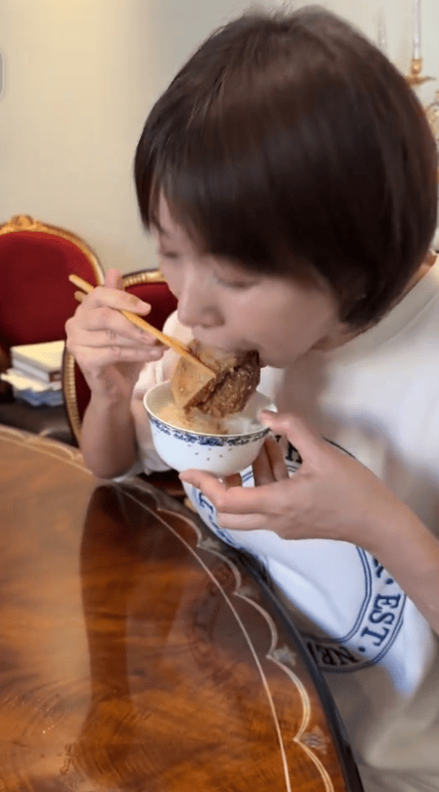 面对一桌美味佳肴,欧阳夏丹盛了半碗米饭,然后夹了一大块扣肉,大口吃肉的她直呼入口即化,肥而不腻,好吃到想哭。