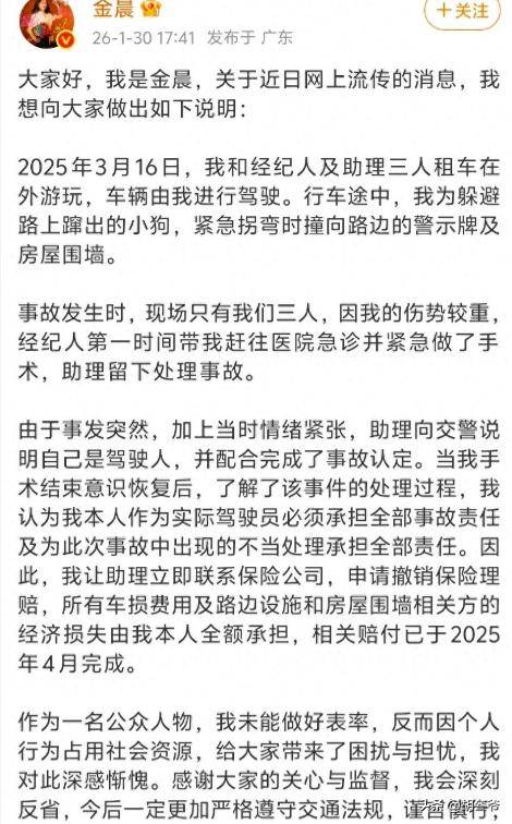 直到2026年2月7日,相关部门正式出具了行政处罚决定书,认定金晨构成造成交通事故后逃逸。