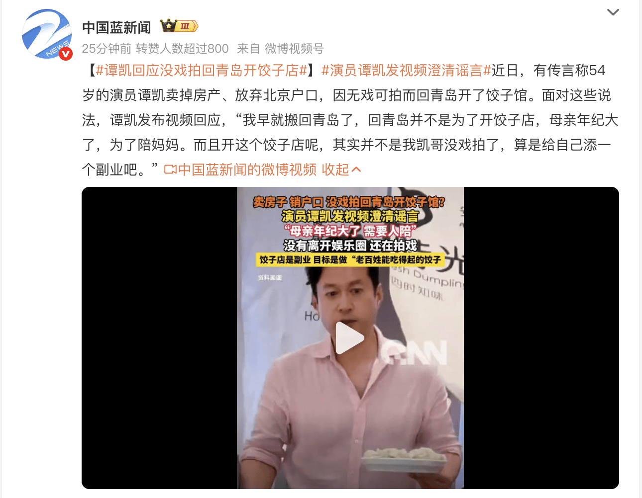 (来源:中国蓝新闻)近日,有传言称54岁的演员谭凯卖掉房产、放弃北京户口,因无戏可拍而回青岛开了饺子馆。面对这些说法,谭凯发布视频回应,“我早就搬回青岛了,回青岛并不是为了