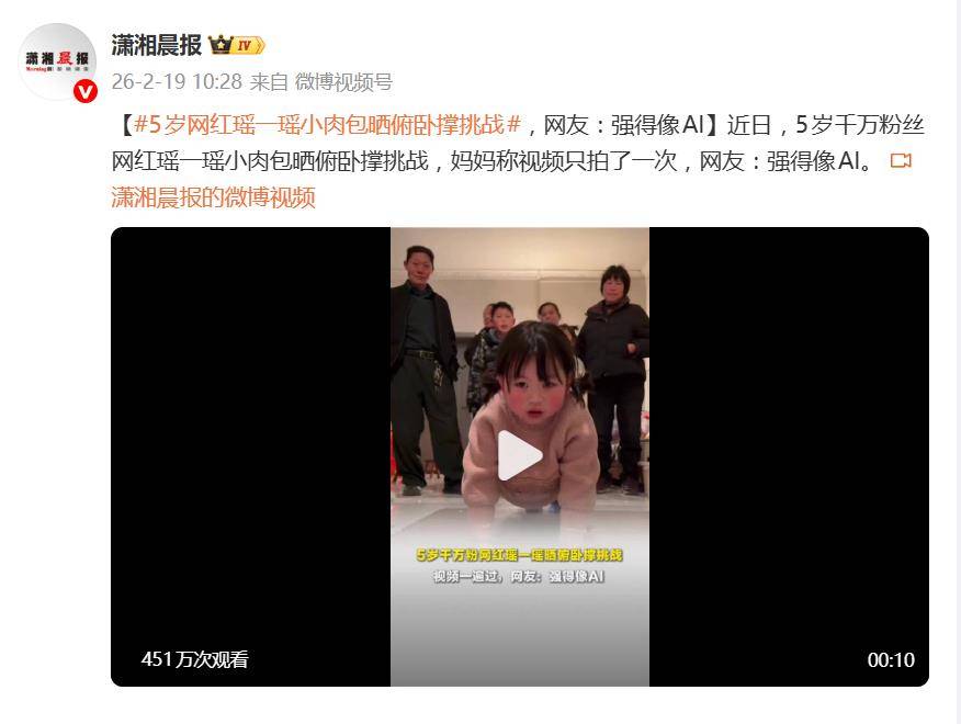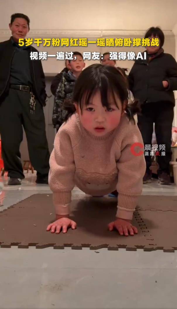 据2月19日报道,近日,一段“5岁千万粉丝网红瑶一瑶小肉包完成俯卧撑挑战”的视频,在网络上迅速走红并引发激烈讨论。视频里小女孩动作标准流畅,被网友戏称“强得像AI”,但随之而来的并非全是赞叹,更多是关于儿童健康、家庭教育与网红经济的深层质疑。