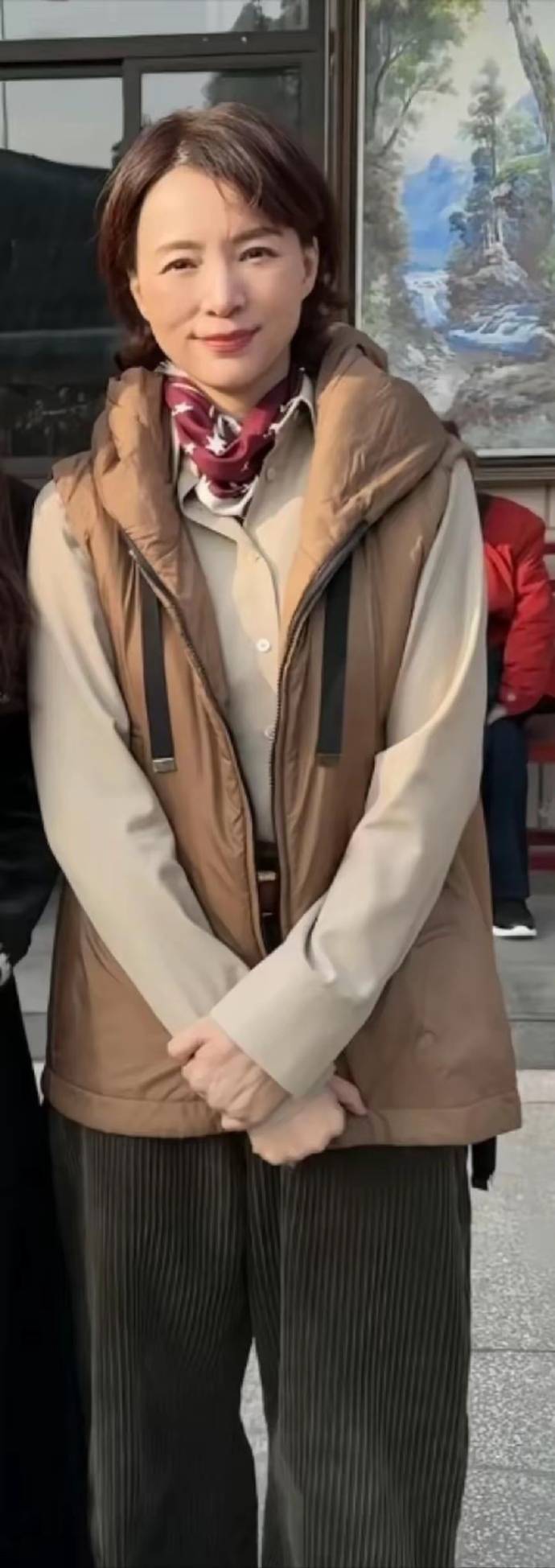 画面中,董卿身穿雅莹品牌的卡其色羽绒马甲,内搭米色衬衫,一条红色印花围巾成为点睛之笔,配上墨绿色的条纹裤和标志性的短卷发。整体造型简约而不失年节氛围,淡妆出镜的她皮肤白皙,笑容温婉,气质出众。网友纷纷点赞:“这状态绝了”、“瘦身后颜值回春,还是那么优雅”。