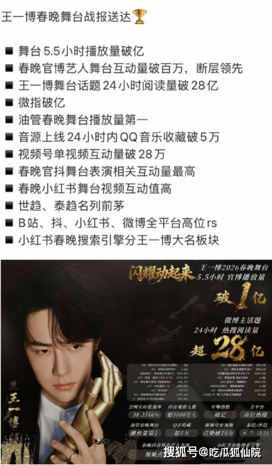 马年新春,王一博用实力炸场春晚,用数据刷新纪录,再次惊艳全网。期待未来,他能继续带着这份对舞台的热爱与敬畏,解锁更多精彩瞬间,在不同的赛道上持续发光发热,续写顶流传奇。