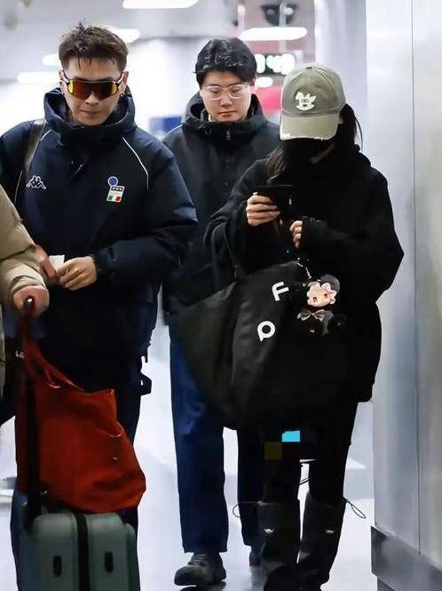 吴谨言手持一个小巧的登机箱,紧随其后,偶尔露出微笑,以回应粉丝们的问候。