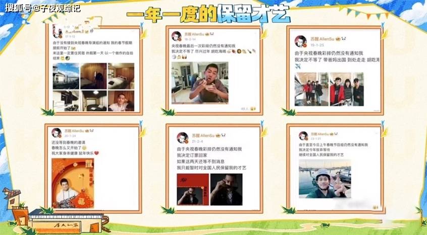 更厉害的是,陆虎突然提起苏醒的行为艺术每年发微博吐槽没被春晚邀请的固定节目。这样一种我自己黑自己的玩法,直接把没上春晚从资源降级变成了人设素材,就好像我们发朋友圈自我嘲笑又是被甲方折磨的一天一样,看起来是卖惨实际上是秀存在感, 苏醒这一波反向操作可真是把互联网玩得清清楚楚。