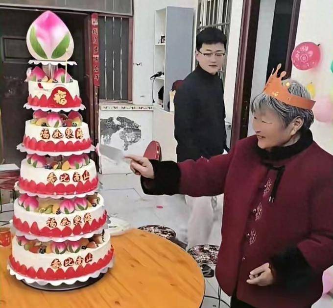 大衣哥女儿朱雪梅初二回了娘家,初三随老公去了姥姥家,姥姥今年80岁,小辈们为了哄姥姥开心,给姥姥准备了6层的寿桃蛋糕,姥姥边笑边数,家庭氛围真的是太好了。