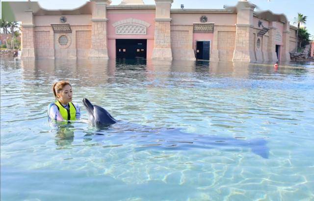 她还分享了水上乐园的开心时刻。其中,她扎着马尾,穿着泳衣和荧光绿马甲,与海豚近距离互动,画面看起来很欢乐。
