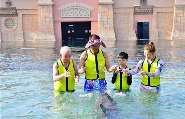 还有一张合照尤为引人注意。照片中,她一家四口跟海豚“玩耍”。她和老公、小儿子做着同样的手势——都伸出了食指,夫妻俩笑容灿烂,小儿子表情略显严肃。值得注意的是,她老公戴着一顶帽子,皮肤偏黑,身材壮实,腰板笔直,看着显年轻,不像是72岁的人。不过,夫妻俩同框能感觉到明显的年龄差。