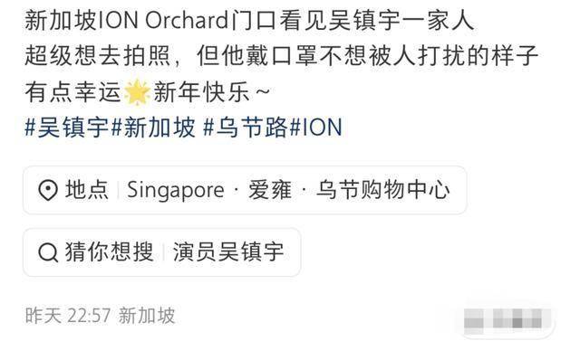 那么问题来了,他们一家是留在香港过年还是去新加坡岳父岳母家过年呢?昨天(2月19日),是大年初三,有网友发文称,很幸运地在当地商场ION Orchard(爱雍·乌节)门口偶遇到他们一家。当时,吴镇宇戴着口罩,一副不想被人打扰的样子,因此网友按耐住想要合影的心情,只是远远地看。