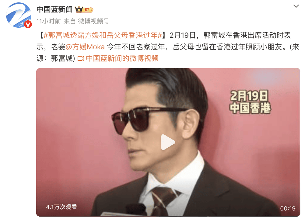 2月19日,郭富城在香港出席活动时表示,老婆方媛今年不回老家过年,岳父母也留在香港过年照顾小朋友。