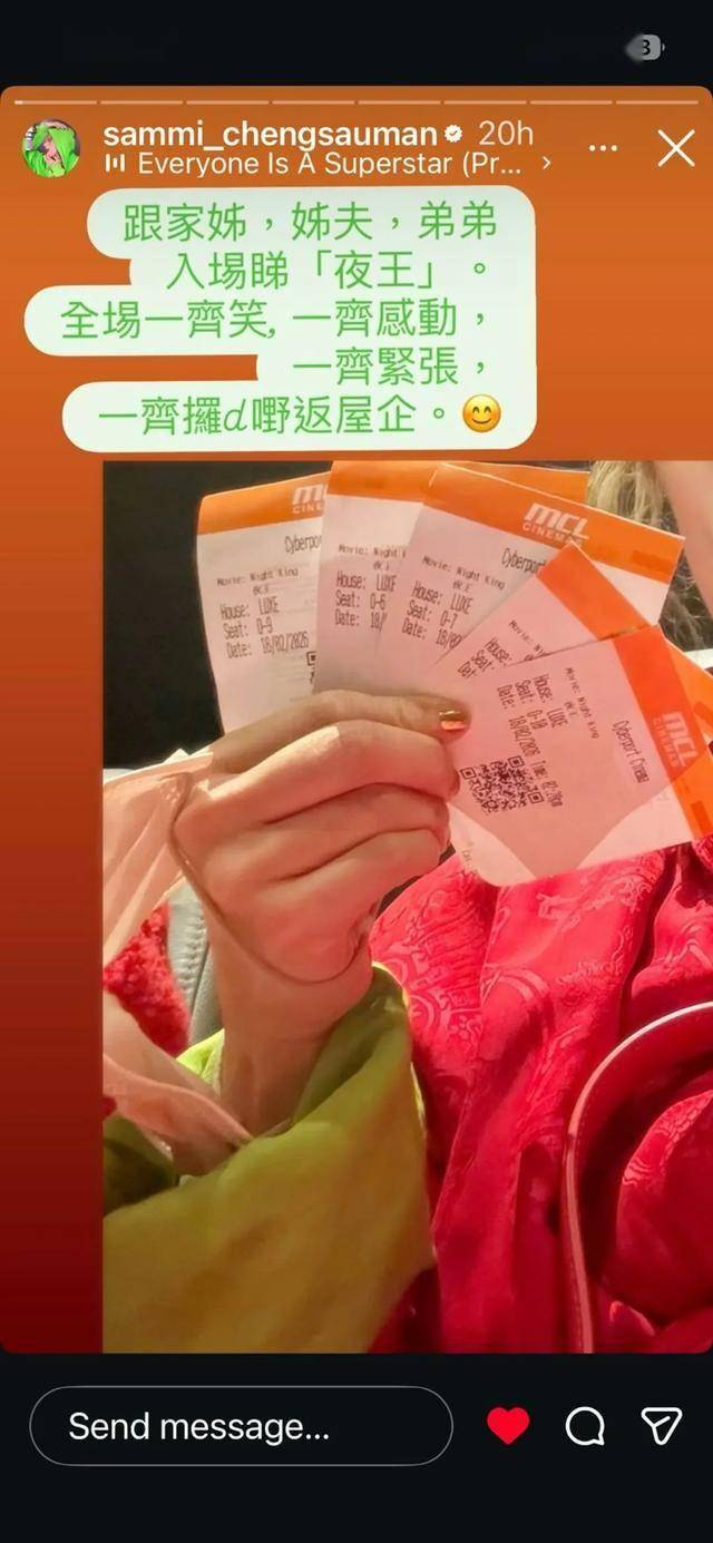Sammi过年前马不停蹄完成一连串宣传后,趁新年假期跟家人一齐入戏院捧V姐(Sammi饰)场,笑住迎马!在社交平台分享跟家姐,姊夫,弟弟入场看《夜王》,全场一一起笑,一起感动,一起紧张,一起拿些东西回家。