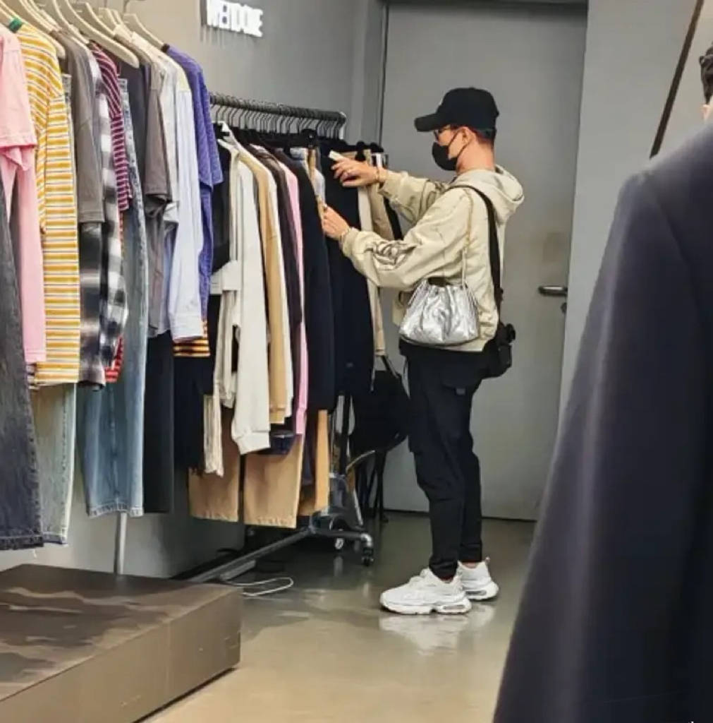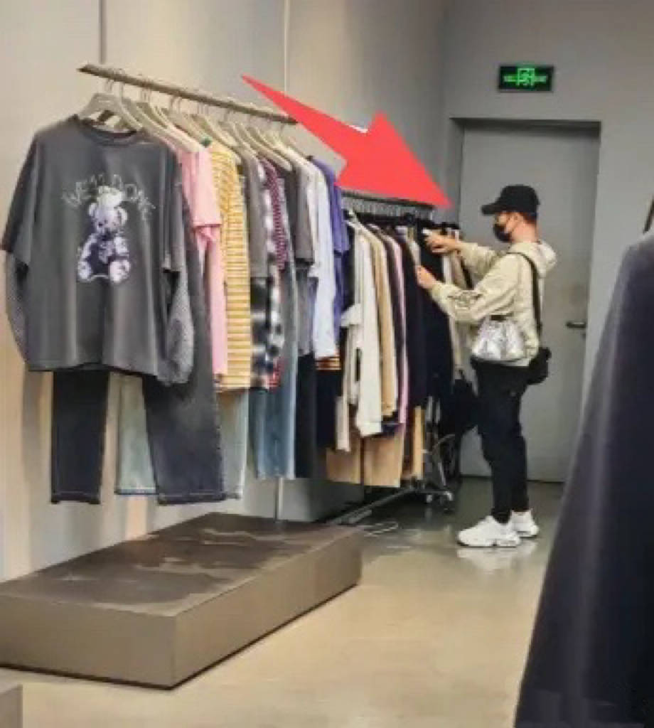 汪峰的肩膀上背着两个包,斜挎包是他自己的,那么银色单肩包就是森林北的。他站在打折区选衣服,远远地看汪峰身材倒是不错,穿休闲外套配锥形裤,看着不那么壮实。