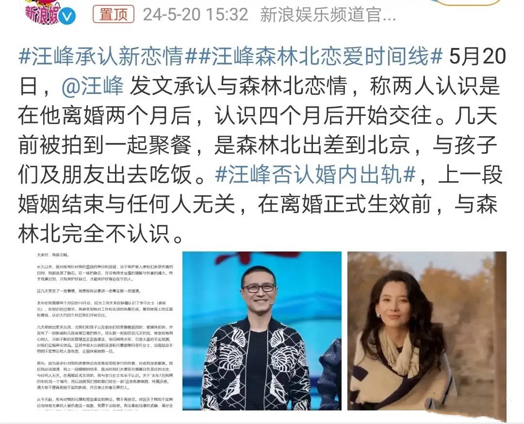 为了给森林北正名,汪峰特意公开了恋爱时间线。表示两个人认识是在离婚2个月后,否认了婚内出轨。且在离婚正式生效前,和森林北没有任何交集,完全不认识。