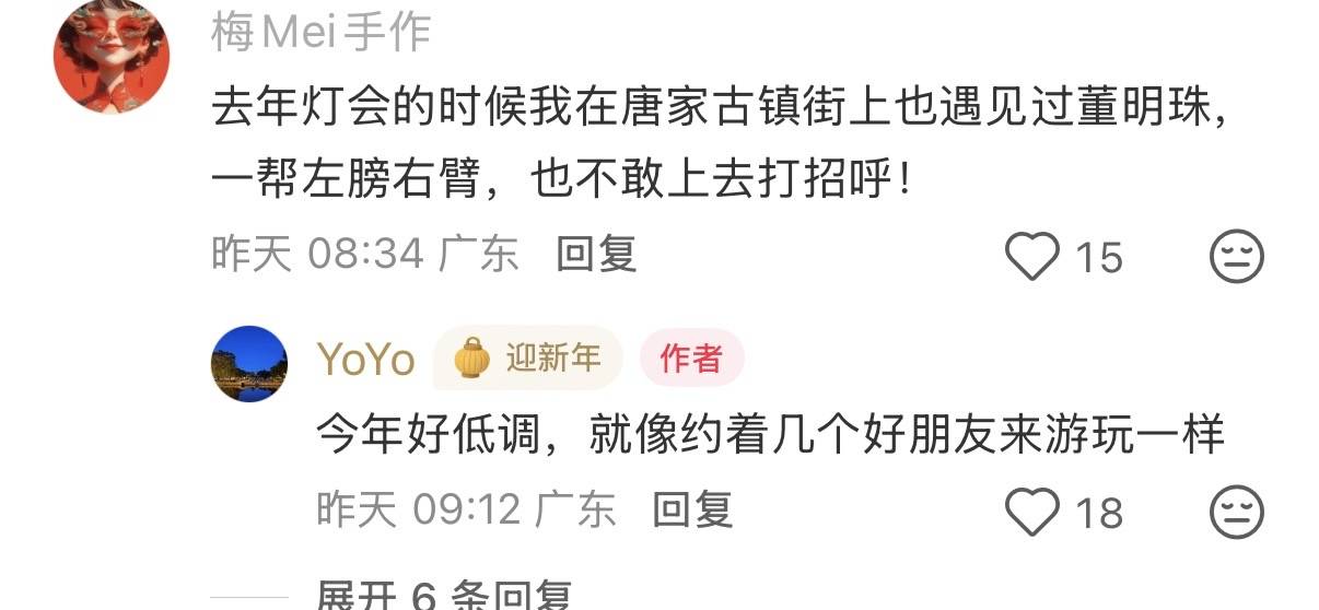 当然也有网友表示去年灯会的时候在唐家古镇街上也遇见了董明珠,那时候一帮左膀右臂、不敢上前打招呼。