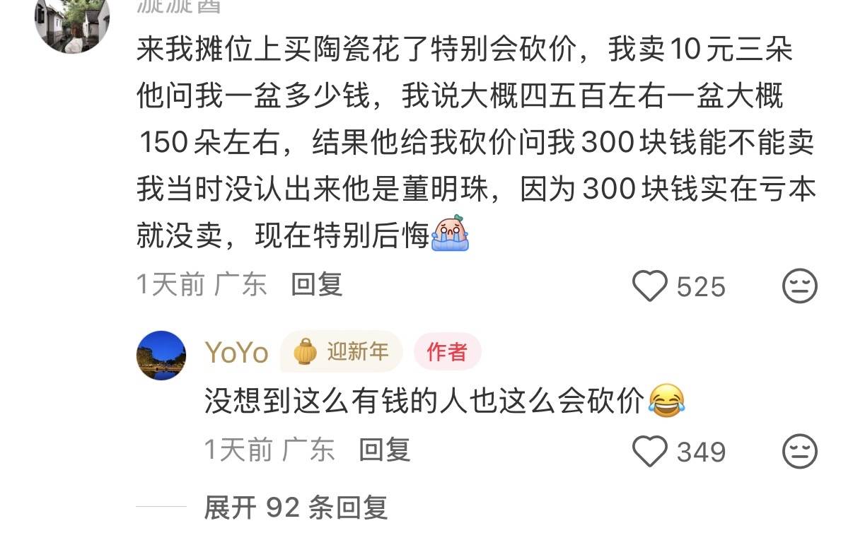 还有网友透露,董明珠来他的摊位上买陶瓷花,特别会砍价。甚至砍价砍得有点狠,一般10元3朵花,董明珠问一盆150朵左右给300块钱卖不卖。