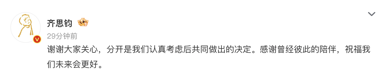 21日,齐思钧在社交平台上发文回应与刘梦章分手,他表示:“谢谢大家关心,分开是我们认真考虑后共同做出的决定。感谢曾经彼此的陪伴,祝福我们未来会更好。 ”
