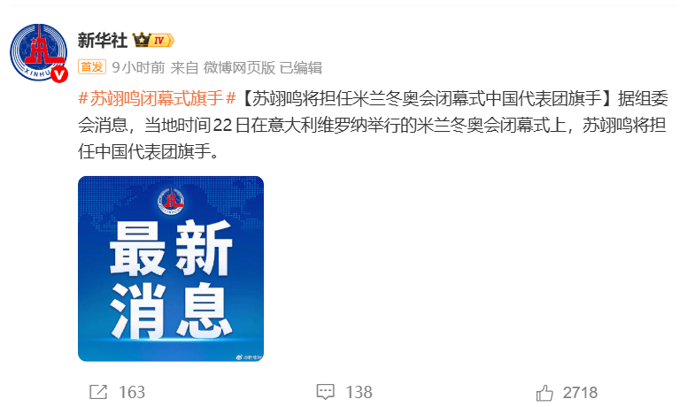 据组委会消息,当地时间22日在意大利维罗纳举行的米兰冬奥会闭幕式上,苏翊鸣将担任中国代表团旗手。