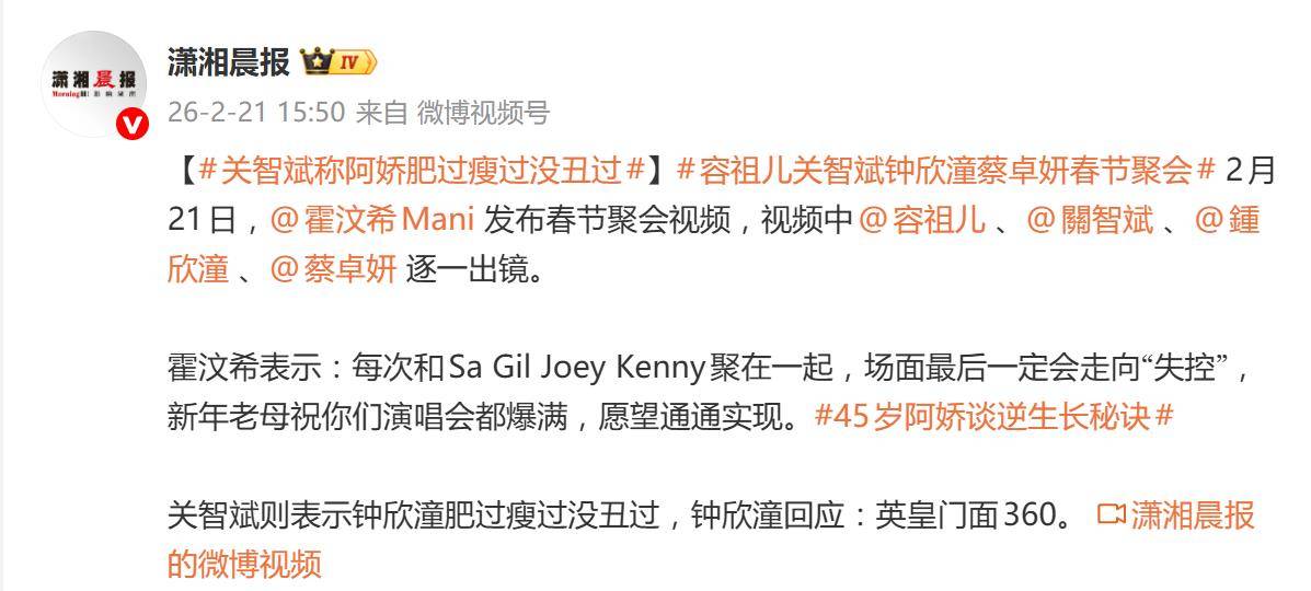 据2月21日报道,一段英皇艺人的春节聚会视频,让“阿娇的颜值”再次成了网友热议的“美学课题”。经纪人霍汶希镜头下的容祖儿、蔡卓妍、钟欣潼和关智斌老友相聚,场面一如既往地“失控”欢闹,而关智斌一句精准的调侃,直接点破了大众多年来的观感。