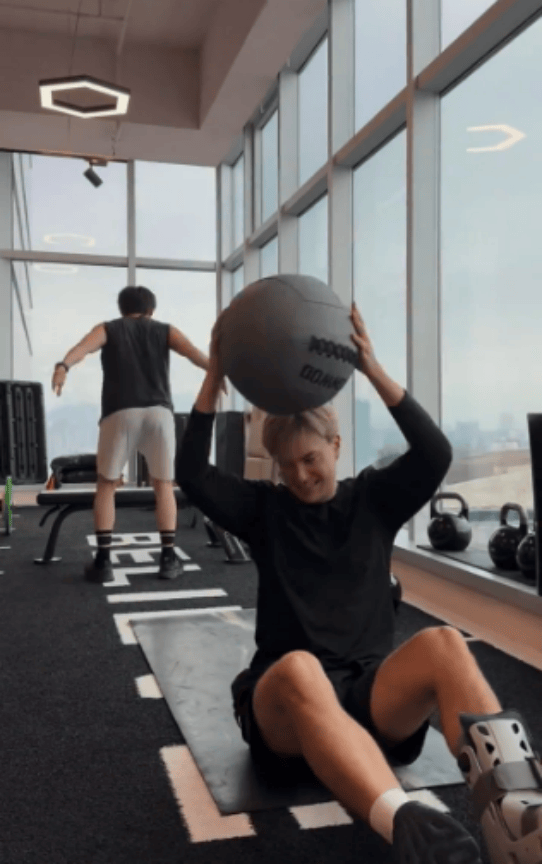 从朱敏瀚分享的短片可见,朱敏瀚在锻炼时脚上仍穿着保护靴,当日朱敏瀚的锻炼,主要是上半身。