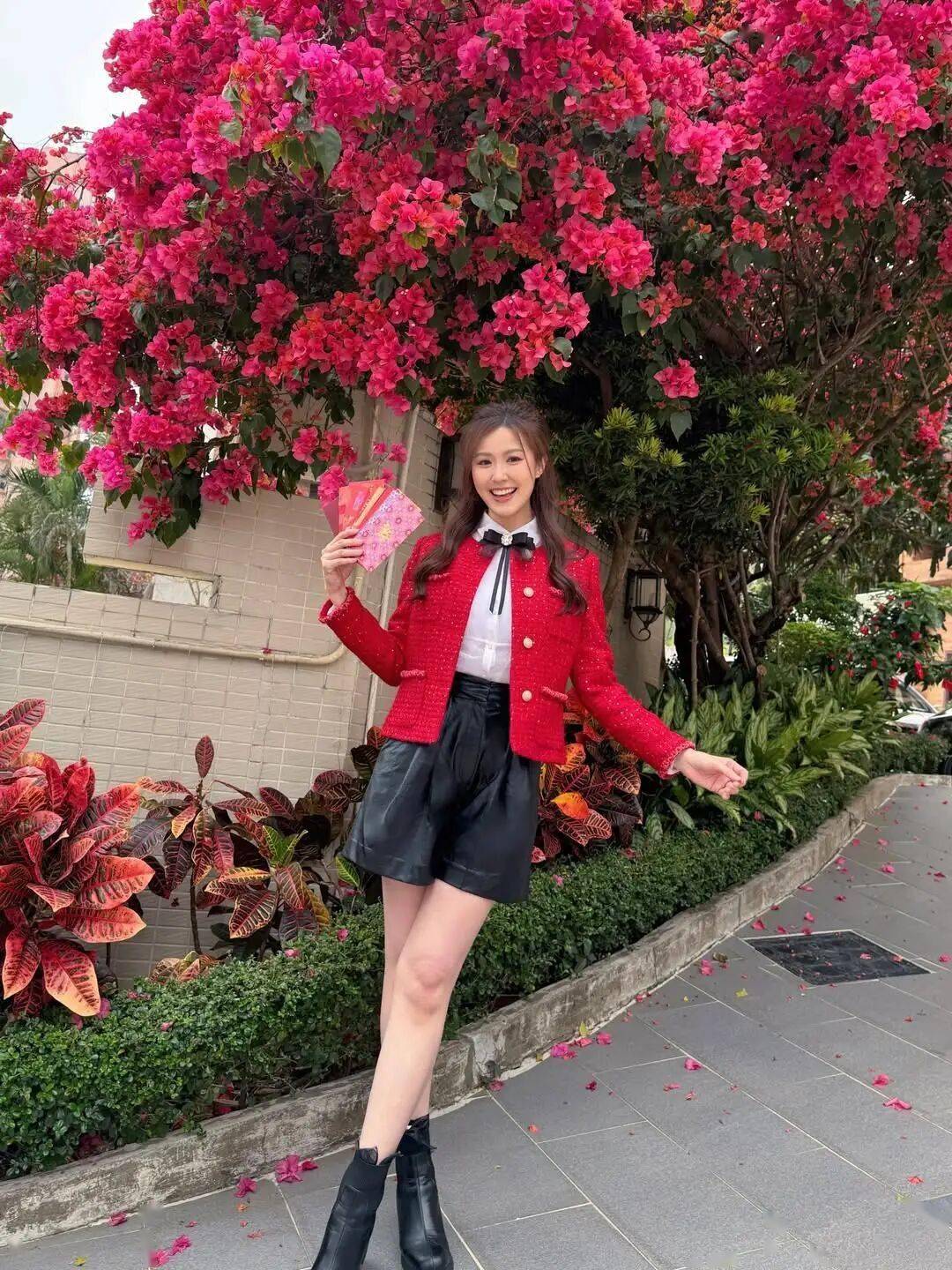 艺人刘佩玥(Moon)近年备受力捧,趁着农历新年假期休息,她在社交网晒出靓照向网友拜年,只见她身穿鲜红外套搭黑色短裤,手拿红包大晒长腿,再加上身后红彤彤的鲜花作衬托,充满了节日气