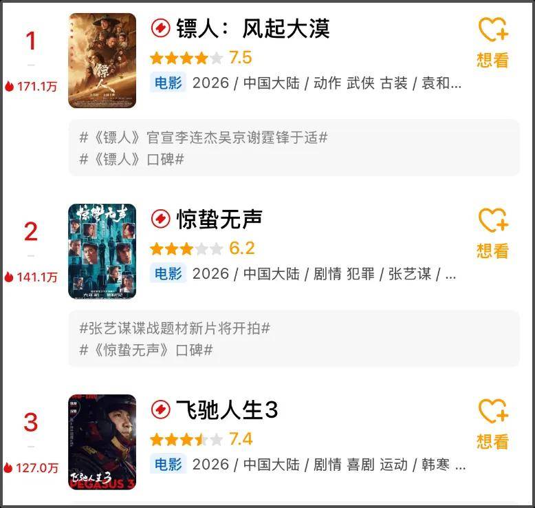 左边是《飞驰人生》续集占据ip基本盘,右边是《惊蛰无声》的“春节就看张艺谋”,《镖人》在这个春节档也算是“夹缝生存”了。
