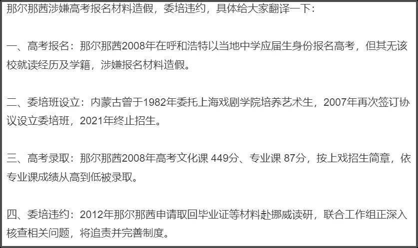 ——那尔那茜定向委培事件相关通报明确表示,那尔那茜涉嫌高考报名材料造假,毕业后又单方面违约,可以说是劣迹斑斑。