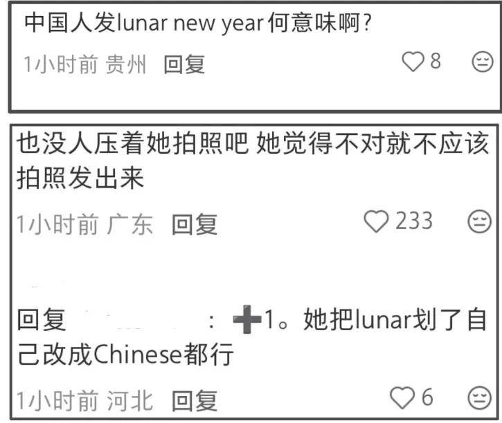 ——有网友发现,42岁女星邓家佳发布新年祝福的时候,明晃晃配上了一张带有“Lunar New Year”的照片,大年初一就发了出来,好几天过去了,哪怕有网友留言提出质疑,她还是没有第一时间删除。