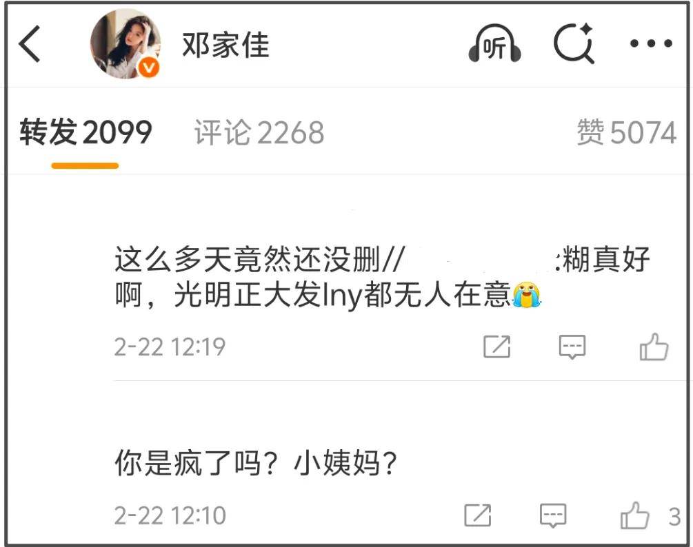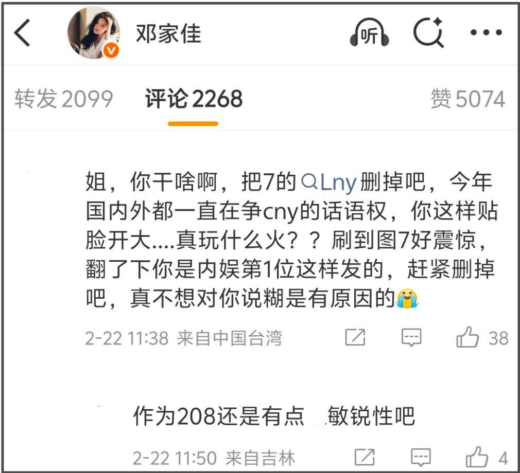 不止一位网友表示对邓家佳“路转黑”了,对她的行为很是无语,网友围观了一圈,发现邓家佳是2026年唯一一个公开发了“LNY”的中国明星,还是在我们自己的平台。