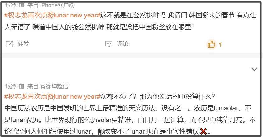 不仅如此,权志龙后续还点赞了大量使用“Lunar new year”的动态挑衅。